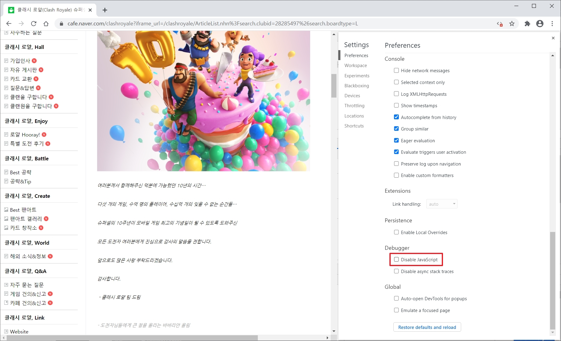그리고 여기에서 Disable Javascript를 클릭화 활성화합니다.