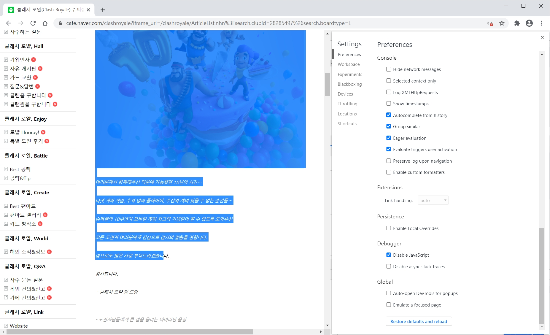 그런데 여기서 나가기 전에 주의할 점이 Disable Javascript 버튼을 꺼두시고 나가야 합니다